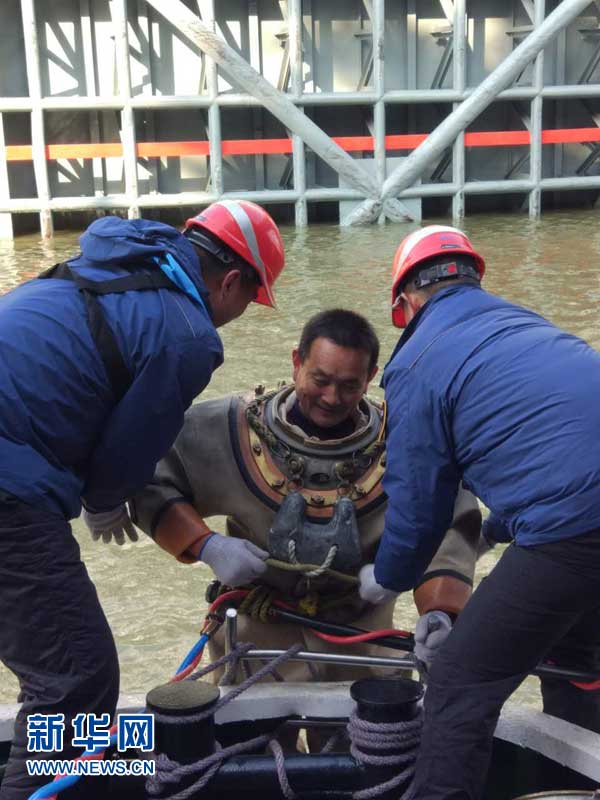 由于水下泥沙浑浊,蛙人下水后依靠的除岸上监控设备外,水下检查全靠对船闸结构的熟悉程度。图为潜水员袁伟伟(右一)正准备下水。