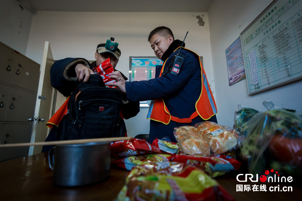 中继站内大部分空间被各种设备所占据,剩下的地方只能摆下一张单人床,只能容纳一个人值守。这次轮到穆凯峰(右)值守,出发前孙学登帮助穆凯峰准备好这两天所需的给养,矿泉水和方便面必不可少。