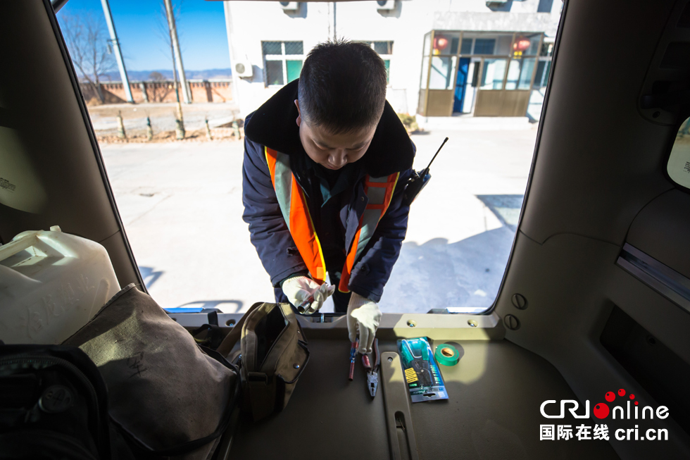 因为9号中继站设在距线路不远处的山顶上,车只能将穆凯峰和所带的生活必需品送到山下,然后通过人工抬到山顶。图为出发前,穆凯峰将生活必需品和工具装上车。