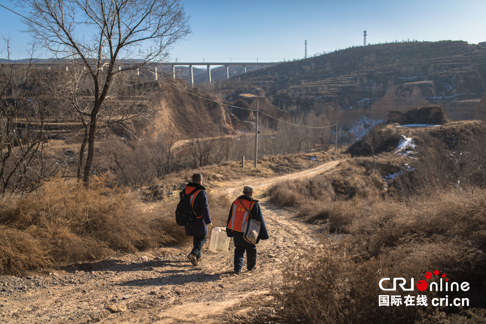 由于值守所需的食物和工具较多,每次都需要两个人一起上山,抵达后送行的人再返回。图为穆凯峰、孙学登带着生活物资徒步上山,白色的桶里装着刷牙洗脸所需要的水。