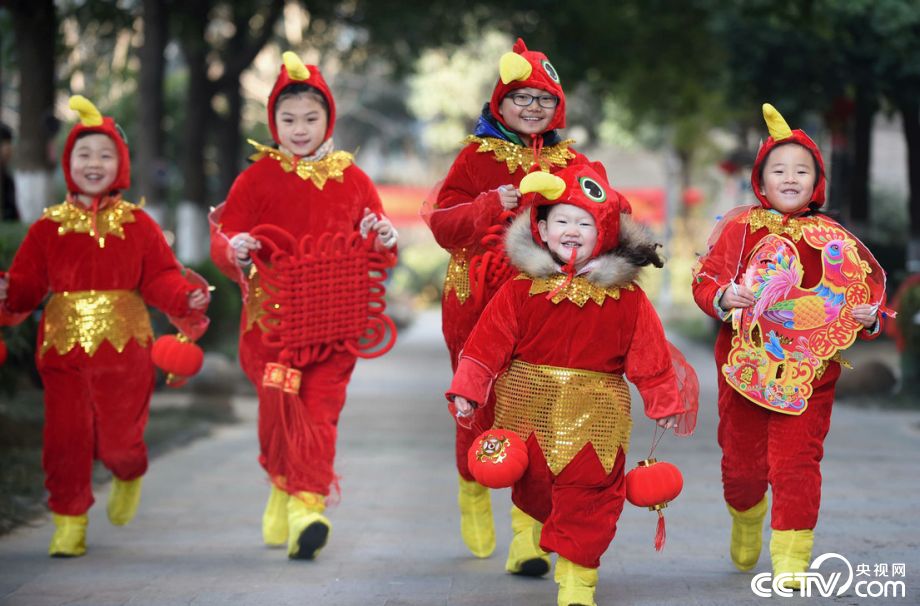 1月24日,合肥市瑶海区明光路街道金大塘社区,孩子们穿上卡通服装,扮演成小鸡,为社区孤寡空巢老人送上“中国结”、红灯笼和剪纸年画。 (央视网记者孔华报道 解琛/摄)