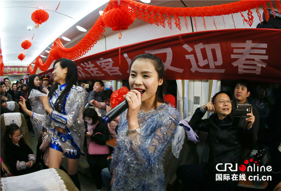 国际在线消息(记者 沈湜):1月25日,由南昌开往北京西的Z68次列车上,一片欢歌笑语。原来,这趟列车上正在举办一场热闹的春节晚会。车厢早已布置一新,到处洋溢着浓浓的节日气氛。