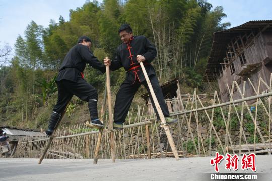 甘溪侗寨侗胞“踩高脚马”比赛。 袁灿平 摄