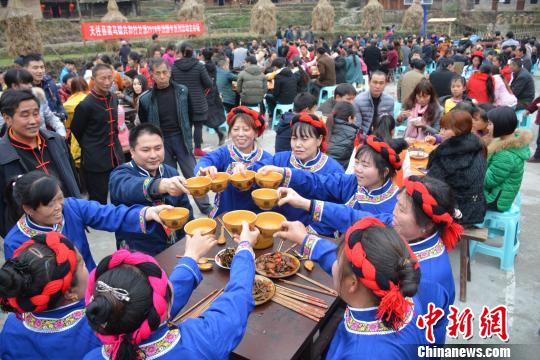 甘溪侗寨侗胞千人同吃团圆饭。 袁灿平 摄