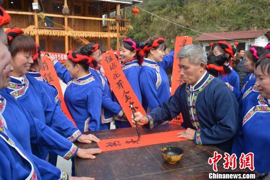 甘溪侗寨侗胞写春联、迎新年。 袁灿平 摄