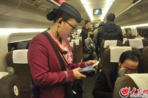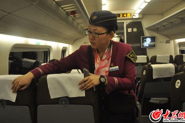 22日早晨5点多,谢元秋已经在D6075次列车上,巡视整列车厢,包括车容、车貌、查票。跟别的列车长不一样,她还兼着业务员负责补票,帮助旅客整理行李,和警长检查有无违禁品,还要保证列车正点出发到站……她这个列车长每天的工作繁琐而沉重。