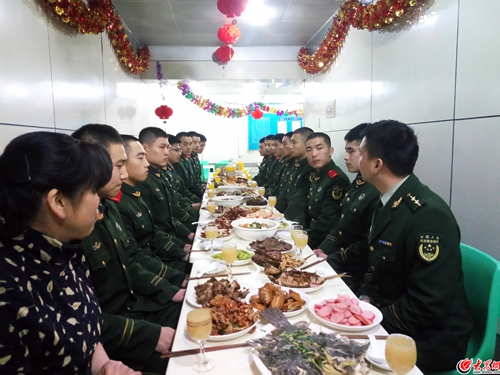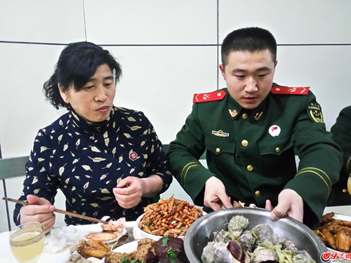 袁彩文做菜的时候,有其他战士过来打下手。战士一边帮忙,一边跟袁彩文拉家常,说说家乡事。“看到纪群伟的妈妈,就像看到自己的妈妈一样。虽然我们不能回家过年,但部队就是我们的家,战友的亲人也是我们的亲人。”战士武艳军说。