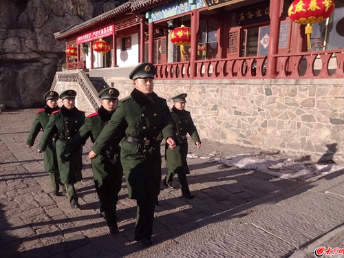 晚上8时30分,战士们接到通知,整装待发准备上岗。袁彩文目送着纪群伟和战友们离开的身影,想了想,又跟上了队伍,静静走在最后,远远地看着儿子的背影。从泰山中队驻地到碧霞祠大概有二十分钟路程,战士们走得很快,袁彩文跟得很吃力,气喘吁吁,却仍是没有放弃。战士们到达执勤地点后,袁彩文还是在寒风中远远的地方望着儿子,舍不得回去。母子二人就这样,默默地站在寒风中,战士守护着泰山、母亲守护着儿子。
