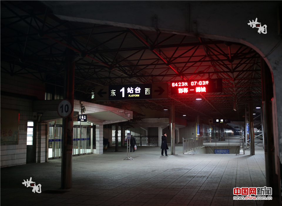 早上,从邯郸发往潞城的6423次列车进入站台准备迎接旅客,一名铁路工作人员正在执勤。