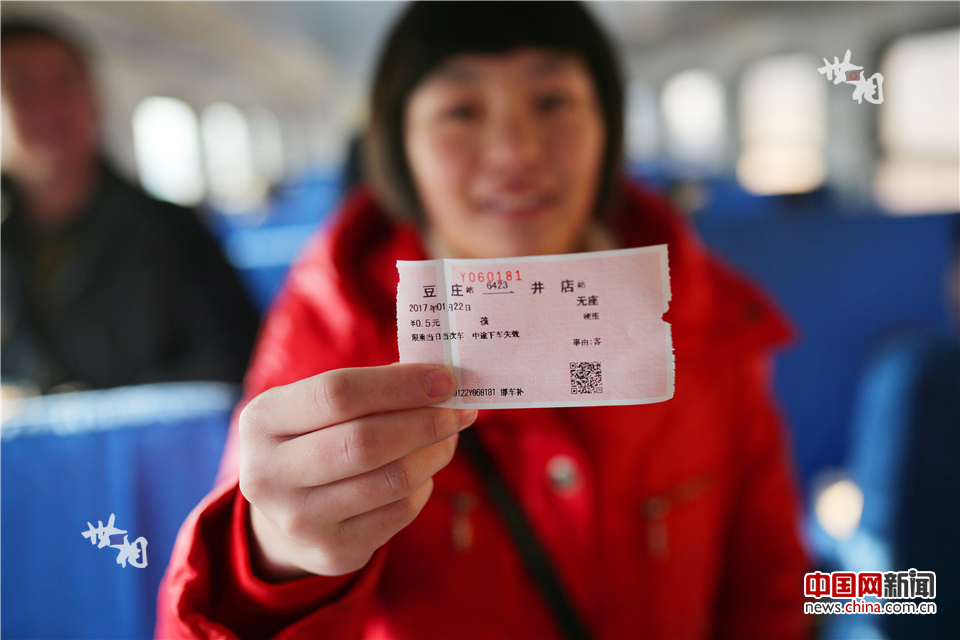 九年级的学生向记者展示自己的车票。她跟随父母从豆庄出发到井店买年货,学生票价仅需0.5元。