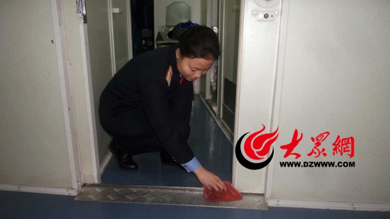 过了商丘站就进入安徽境内,23:23到达砀山站,间隔时间47分钟。这时,温丽娜轻轻关好车厢门,防止过道上的风吹进车厢里。随后,她拿出抹布依次拭擦两节车厢连接处的门窗和地面。她蹲着,先用湿布擦掉浮土,然后又用拇指在地面滑一下看看干净不干净,再用干布擦掉水痕,直到地面变干为止。记者赶忙过来帮忙,手碰到车厢地面,很凉!