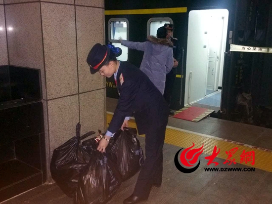 送走下车的乘客,迎来上车的乘客,温丽娜在两个车厢忙活着,一点睡意也没有,直到次日凌晨3:28,列车到达山东兖州,与替班交接后,她提着三大包垃圾下车放到站台上的垃圾回收处,才回车休息了。