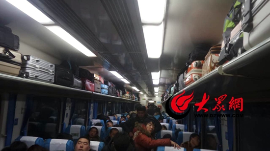 在青岛至曹县列车上,温丽娜整理的行李架。房海滨摄