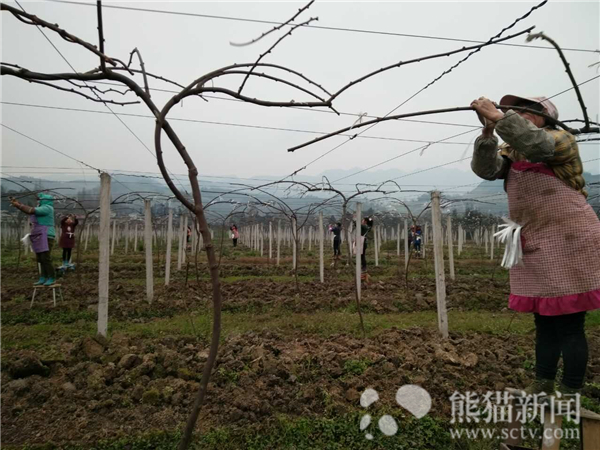 将去年挂果后的树枝剪除并清运,将符合要求的树枝用绳索固定,在整齐树立的水泥杆与纵横交错的铁丝线间,村民们对每一棵果树进行着精心护理,现场一片繁忙。