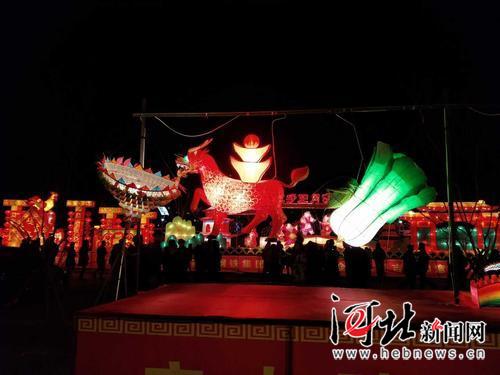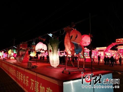 花会巡演结束,天刚黑,各式各样的花灯如约点亮,引来当地百姓及京津等外地游客竞相观赏。此次灯展主要设置了“寻根溯源”“时代欢歌”“畅想未来”“年的味道”“梦幻时空”“欢乐童年”等六个主题灯区,灯展绵延几里地。
