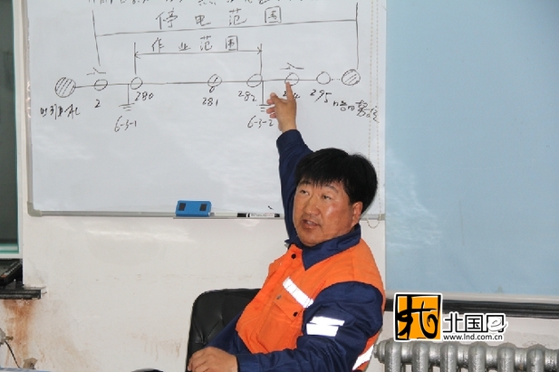 图3:施工前,吴建军主持召开施工例会,讲解停电示意图,确定停电范围,研判安全风险,确保施工有序开展。