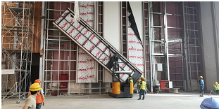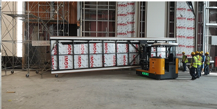 施工团队进行头脑风暴,将工业叉车拿来改良,变身成拼装机器人。叉车前部安装了一个“手臂”,最多能举高4.5米,还能360°旋转。“手臂”前端装上“夹子”,用来夹住铝板,最多能承载1600公斤,力大无穷。