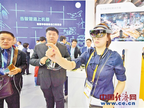 一位参观者在美国通用电气展区体验虚拟现实设备检测电力系统。经济日报-中国经济网记者 高兴贵摄
