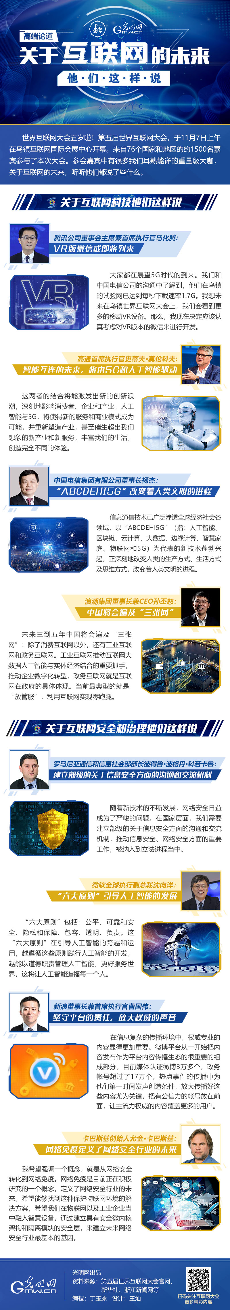 世界互联网大会五岁啦!第五届世界互联网大会,于11月7日上午在乌镇互联网国际会展中心开幕。来自76个国家和地区的约1500名嘉宾参与了本次大会。参会嘉宾中有很多我们耳熟能详的重量级大咖,关于互联网的未来,听听他们都说了些什么。