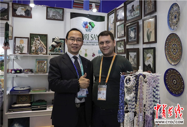 11月8日,一位来自塔吉克斯坦的参展商和上海徐汇区旅游局的工作人员合影留念。中国青年报·中青在线记者 李峥苨/摄