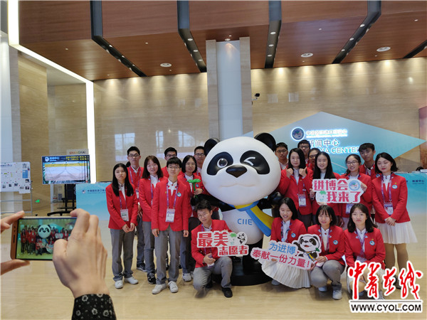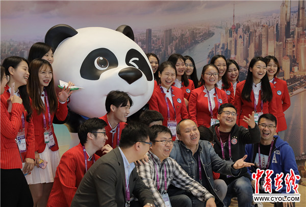 11月10日,进博会迎来最后一天。许多志愿者抓紧机会与进博会吉祥物“进宝”合影。中国青年报·中青在线记者王林 /摄