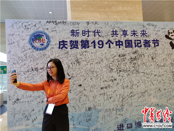 11月10日,进博会迎来最后一天。一位前来报道进博会的记者与记者节背景板合影。中国青年报·中青在线记者王林 /摄