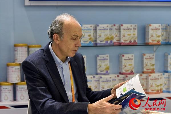 英国奶粉厂商麦克马洪正在检阅专门为参加进博会而更新的产品手册。人民网记者翁奇羽摄。