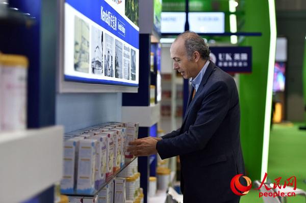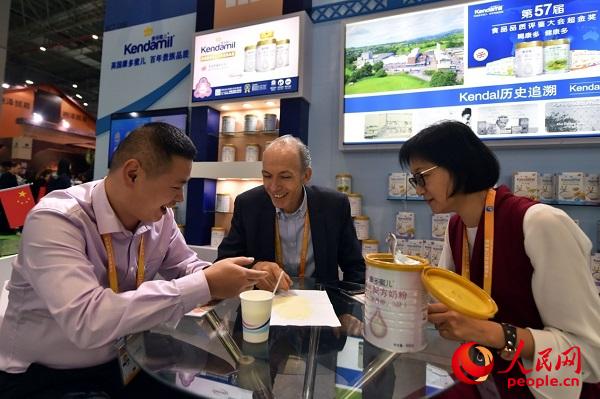 麦克马洪在进博会的康多蜜儿奶粉展台上。人民网记者翁奇羽摄。