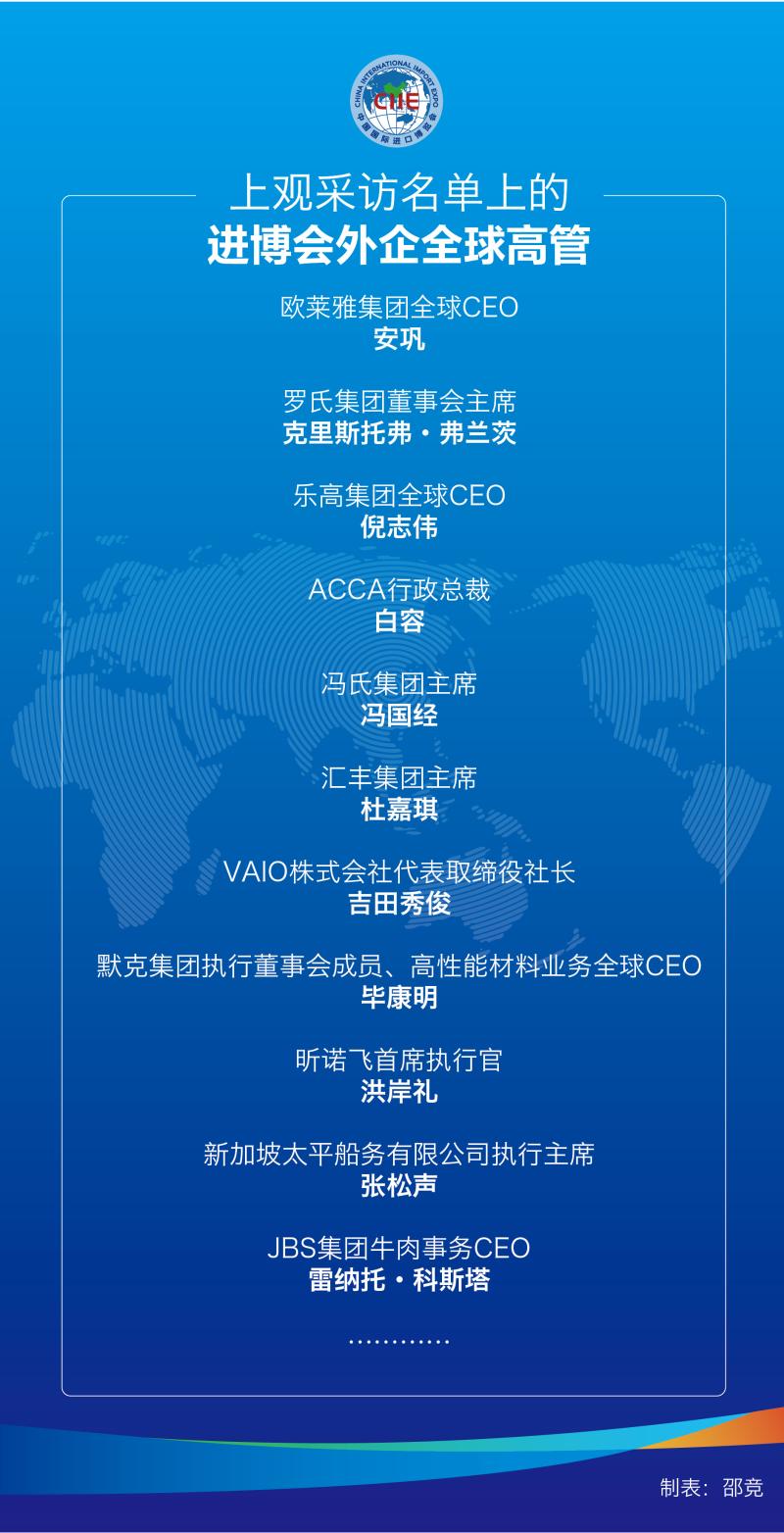 进博会期间,解放日报·上观新闻面对面专访了一系列跨国公司全球高管,他们都从海外总部专程赶来,来自各行各业,都在全世界商业界具有巨大的影响力,部分全球企业的“一把手”还走进解放日报·上观新闻的进博会演播室,面对镜头,侃侃而谈。