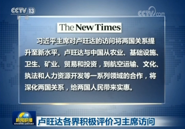 卢旺达主流英文媒体《新时代报》23日发表社论称,习近平主席对卢旺达的访问将两国关系提升至新水平。文章说,卢旺达与中国从农业、基础设施、卫生、矿业、贸易和投资,到航空运输、文化、执法和人力资源开发等一系列领域的合作,将深化两国关系,给两国人民带来实惠。
