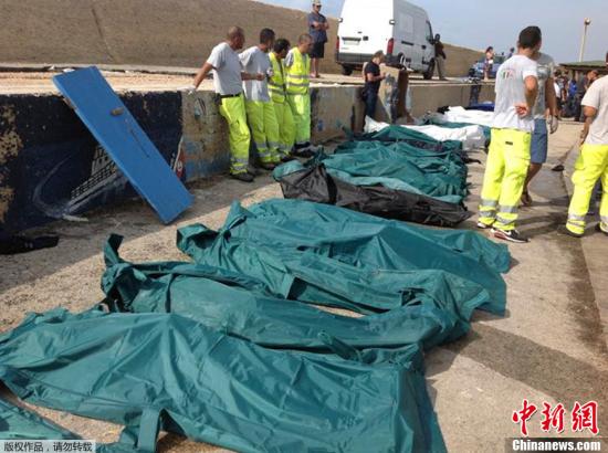 10月3日,一艘搭载了大概500名移民的船只在意大利蓝佩杜萨岛附近起火并沉没。图为在意大利兰佩杜萨岛的港口,遇难移民遗体被安置在岸边。