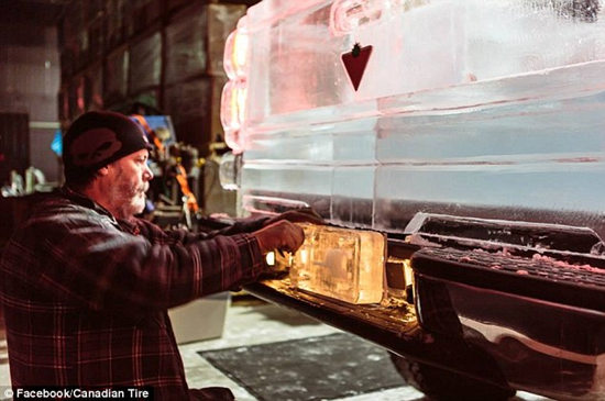 在普通的汽车底盘上,来自加拿大安大略省的冰雕团队制作了这台“冰车”,包括牌照和松树形状汽车香片都是用冰做的。