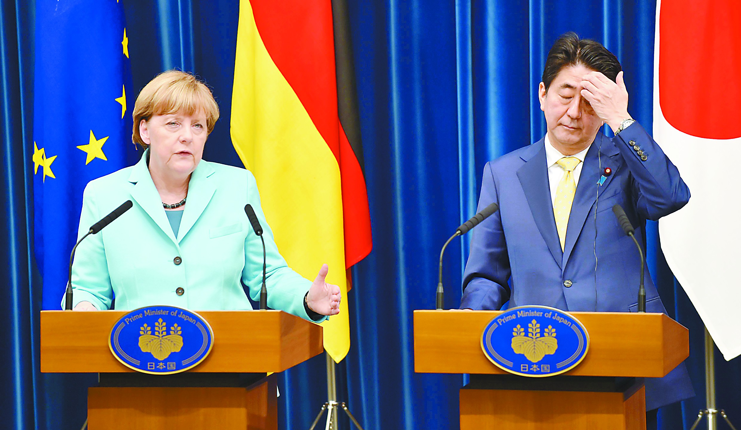9日傍晚,正在东京访问的德国总理默克尔与日本首相安倍晋三一同出席记者会。