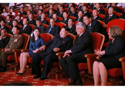 金正恩偕夫人与古巴代表团看演出。(朝鲜《劳动新闻》网站)