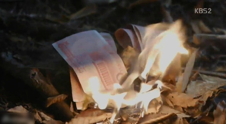 日前,韩国一电视剧最新一集播出两主角跋山涉水的场景。夜半寒冷,两位男主角点着了火不够旺找纸找不到,剧中“上海集团”公子拿出几张人民币来点火。此画面引来众多中国网友不满。图为男主角找纸。