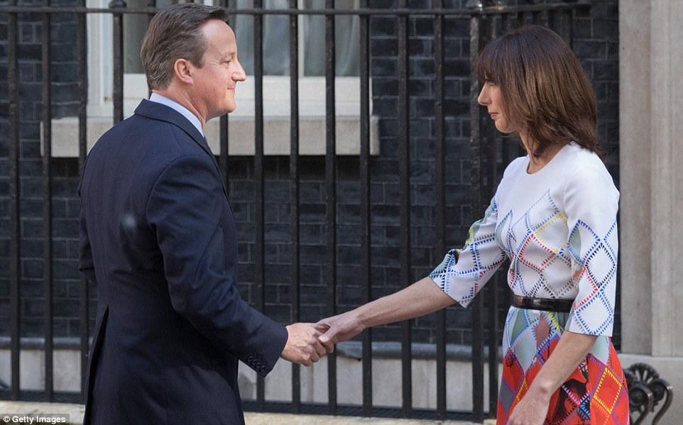 交握:当卡梅伦说完“英国需要一位新首相”后握住了妻子的双手,而萨曼莎此时只能回复他一个勉强的微笑。