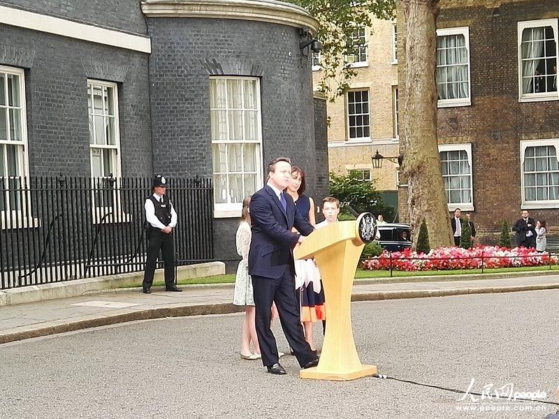 7月13日,大卫·卡梅伦在前往白金汉宫向女王提交辞呈前,在唐宁街10号前携家人发表离任致辞。(王一三杨波白天行)