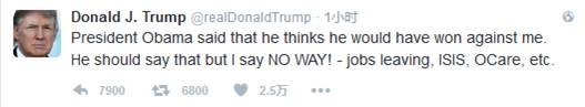 针对奥巴马的言论,特朗普在社交媒体“推特”上回应称:“奥巴马总统自认为可以(在大选中)击败我。他可以这么说,但我认为‘没戏’!因为离职、IS还有奥巴马医疗法案等问题(的存在)。”