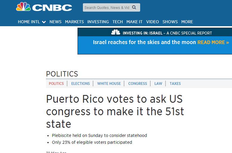 上世纪60年代以来,就与美国的地位关系,波多黎各举行了4次全民公决。前三次公决中,成为美国第51个州的方案都被否决。2012年第四次公决中,虽然做出决定的选民中,超过半数赞成“成为美国的第51个州”,但是三分之一以上选民未作决定,因而这一结果的合法性受到质疑。一些选民认为,成为美国的一个州,能获得更多联邦资金支持,帮助波多黎各经济摆脱危机。波多黎各已经连续10年经济衰退,负债超过700亿美元,实际上已经破产。当地失业率达到12%,贫困率高达45%;340万居民中,超过50万人已经前往美国本土找工作。