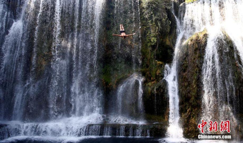 当地时间8月5日,波黑亚伊采,第四届瀑布跳水国际大赛正在举行,共有23名参赛者参加,他们将挑战21米高瀑布。