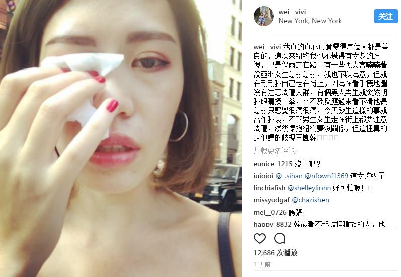 她在Instagram写下“我真的真心真意觉得每个人都是善良的,这次来纽约我也不觉得有太多的歧视,只是偶尔走在路上,有一些黑人会喃喃着说亚洲女生怎样怎样”。