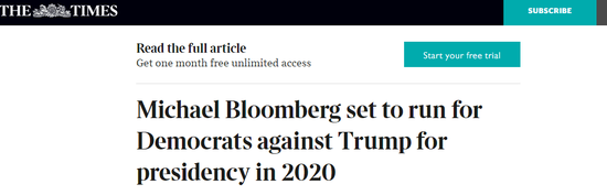 《泰晤士报》在题为“迈克尔?布隆伯格将争取以民主党人身份参加2020年总统选举,挑战特朗普”报道中称,布隆伯格已经告诉知情者,他正计划参加总统竞选。“迈克尔?布隆伯格告诉我他将参加2020年大选”,一位消息人士说道,“他有钱坚持到底,而其他候选人(在这个过程中)自己就放弃了。”