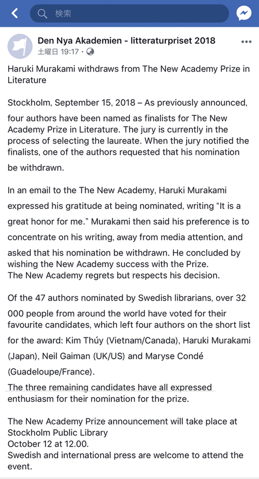 不过,“新文学奖”组织者15日在脸谱网上发布公告称,村上春树本人希望“专注于写作,远离媒体关注”,所以决定退出奖项的角逐,但对能够获得提名表示感谢。