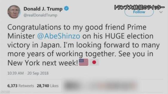 原标题:特朗普发推祝安倍三连任并邀约:我的好朋友,下周纽约见!