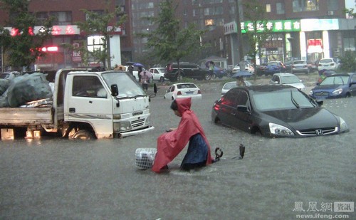 北京突降暴雨,朝阳区北苑家园望春园小区及周边道路积水严重,汽车被淹。