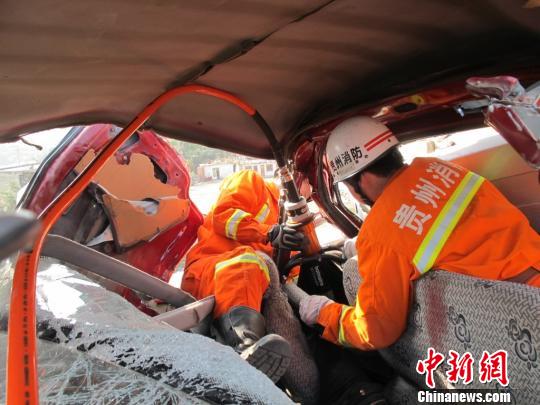 救援人员用破拆工具拆卸面包车。 申明 摄