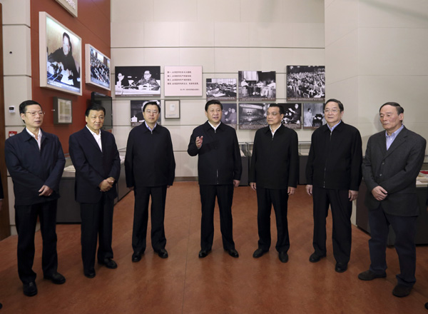 11月29日,中共中央总书记、中央军委主席习近平和中央政治局常委李克强、张德江、俞正声、刘云山、王岐山、张高丽等来到国家博物馆,参观《复兴之路》展览。新华社记者 兰红光 摄