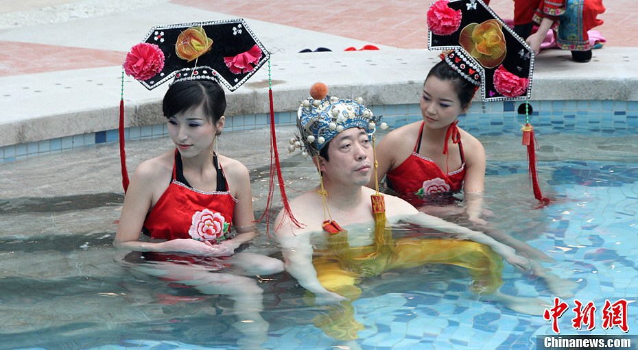 位于河南鲁山县上汤镇的尧山福泉于2月2日开业,山西客人花费十万元拍得“帝王头汤”,在开业现场做帝王扮相,在“嫔妃宫女太监”们的服侍下,享受了帝王待遇和福泉头道汤的待遇,场面香艳,观众大呼雷人。王中举 摄