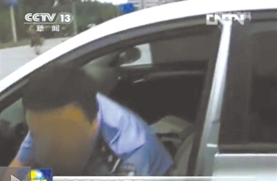 一交警知法违法,驾驶无牌车上路被查处。央视截屏