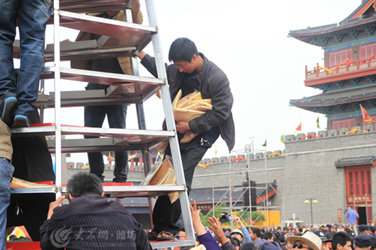 大众网潍坊5月7日讯(记者 于明效)5月7日上午,在山东省临朐县“祈福沂蒙山(沂山)”景区举行的中国第二届沂山文化节上,工作人员用近万斤五谷杂粮做的当地沂蒙山煎饼,搭建了一个高达6米、世界最高的“祈福煎饼塔”,以祝福祖国繁荣富强、国泰民安、五谷丰登。但让人始料未及的是,祈福仪式刚一开始,就有游客不顾劝阻抢夺这些作为供品的煎饼,随后,更多的游客加入了哄抢队伍,只有短短的十多分钟,进万斤煎饼就被哄抢一空,现场仅剩下光秃秃的铁架子。